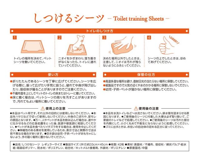 しつけるシーツは、ワンちゃんのおしっこの量や色がわかりやすい、白いペットシーツです。いつもよりおしっこの量が少ない、多い、色がいつもと違うなど、ワンちゃんの健康管理の一つとしておすすめできるペットシーツです。